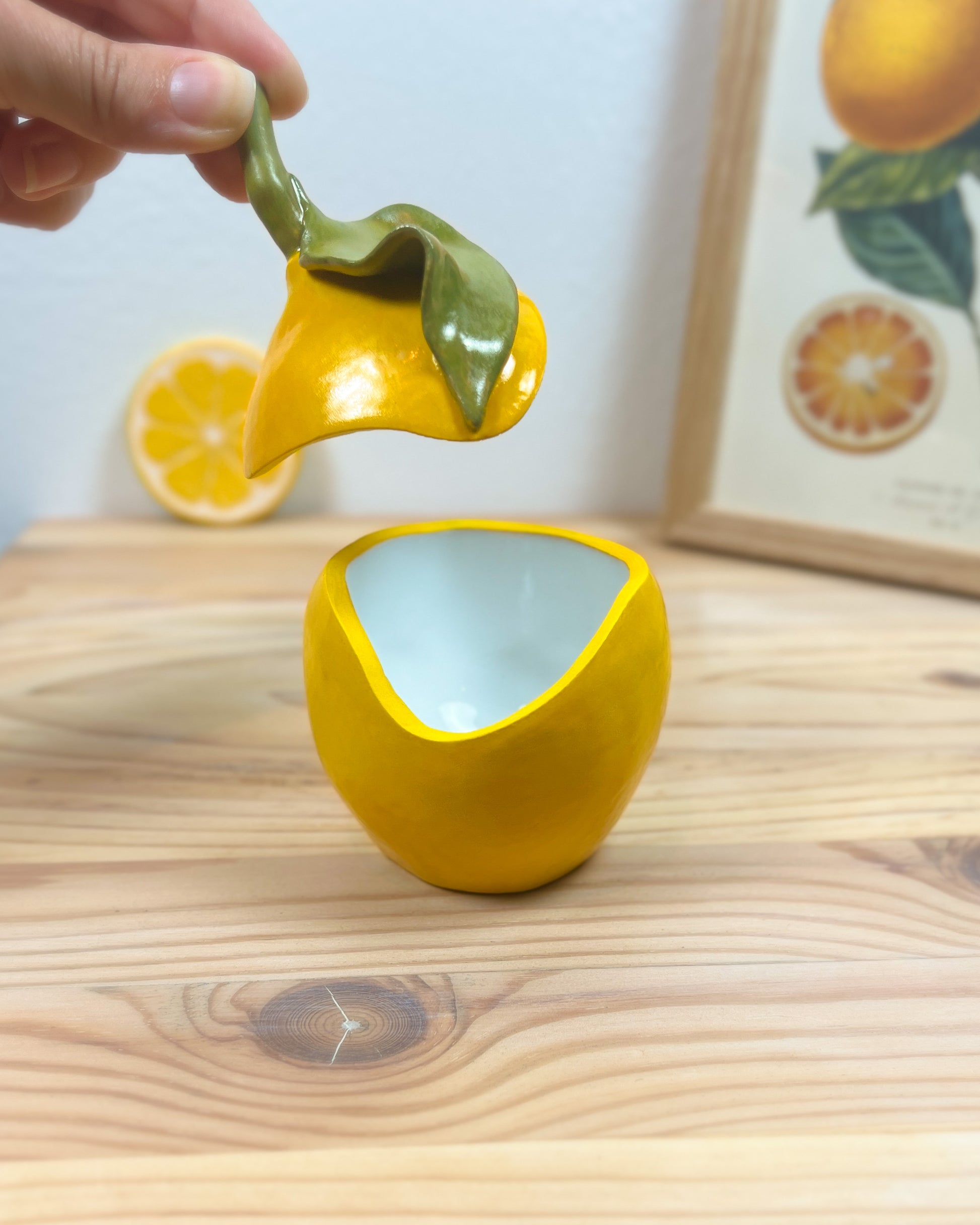 Handbyggd burk i form av en citron. Med lite ojämnhet för att få känslan av en riktig citron. En härligt varmgul färg på utsidan, dämpad grön färg på stjälk och blad. Utsidan är halvblank och insidan är högblankt vit.