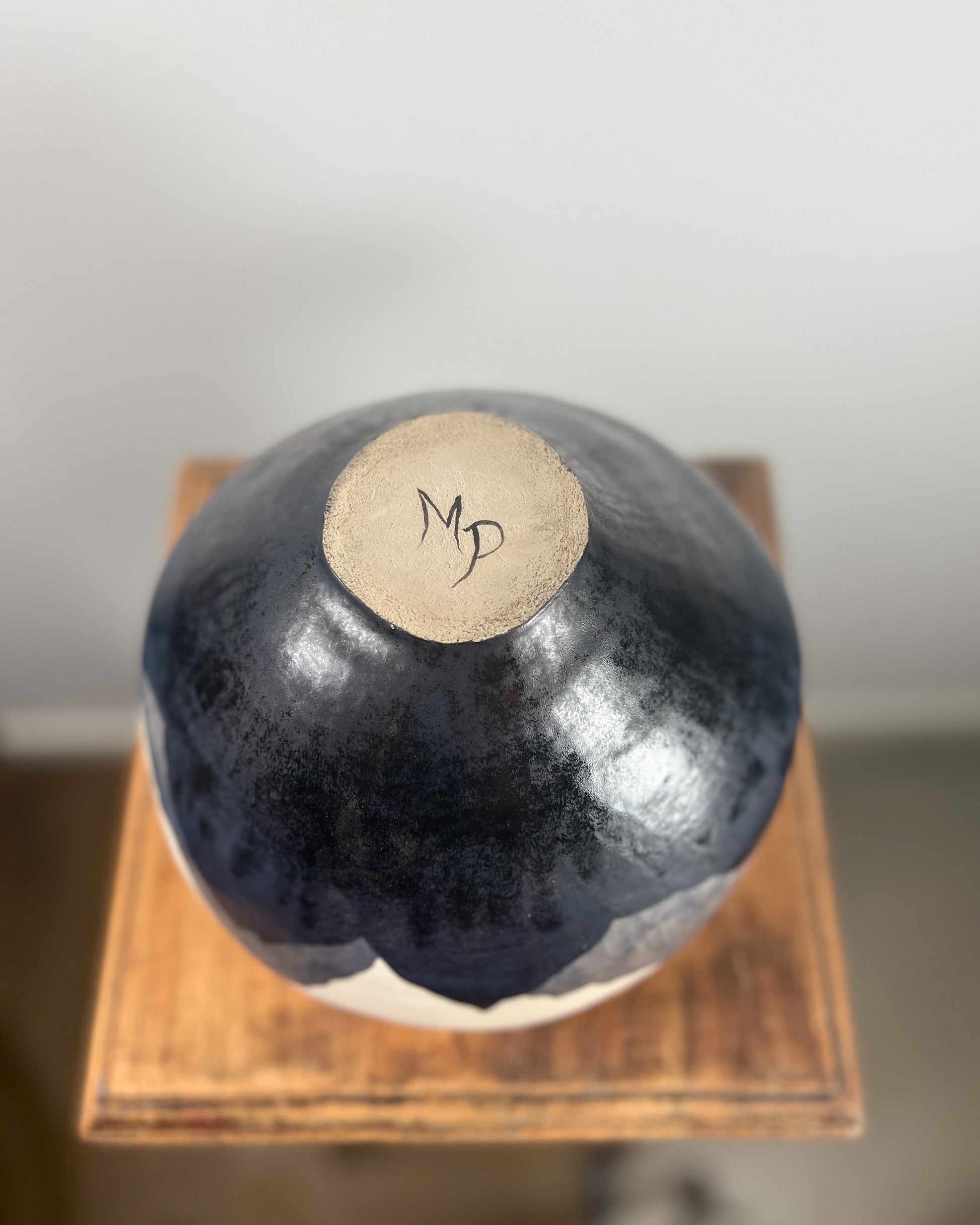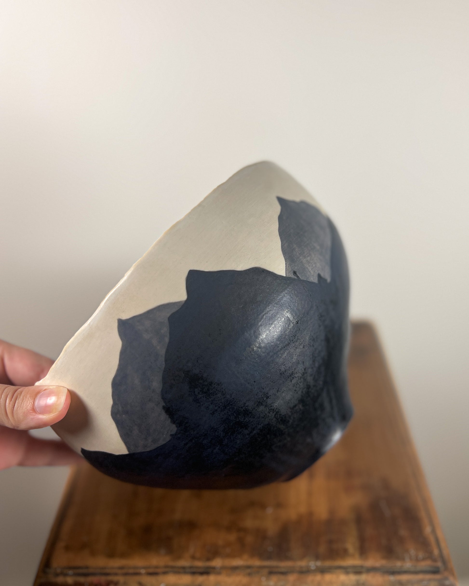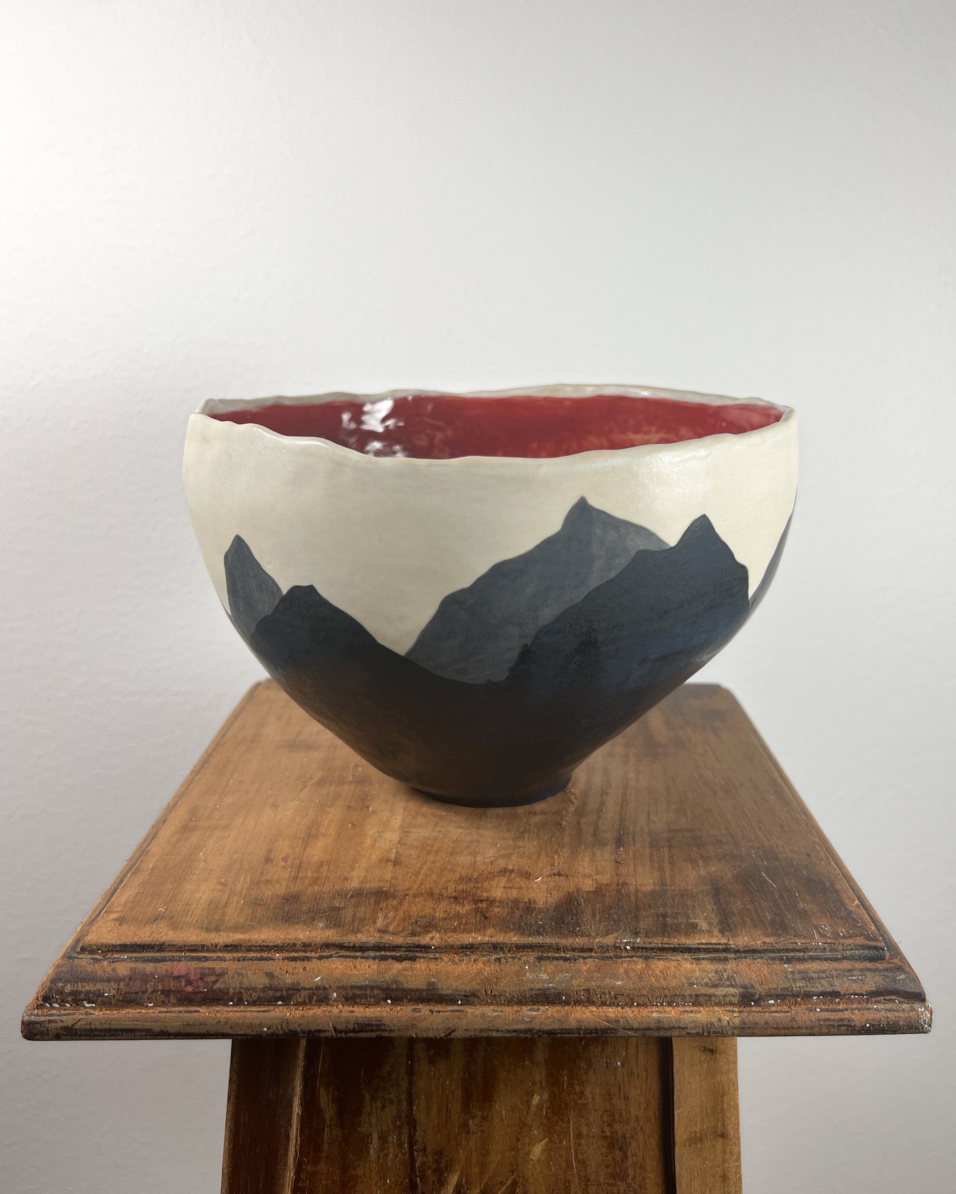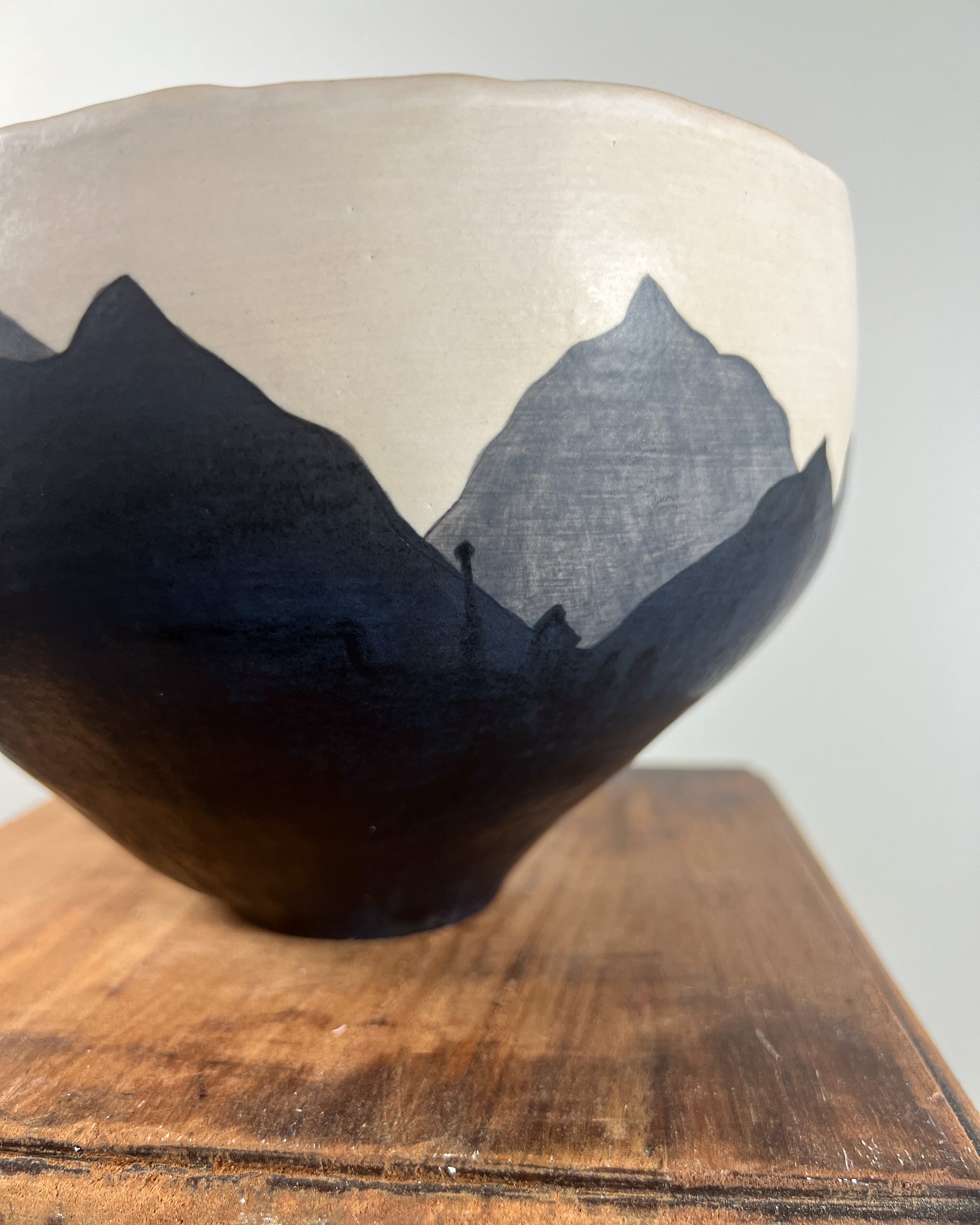 Handbyggd skål med svängd ojämn kant. Utsida med motiv av berg i två olika nyanser. Längst ner kan man skymta formerna av några hus och en flaggstång och några trädtoppar. Den svartare nyansen går gärna åt lite metalliskt blå svart. Basen på skålen är varmt vit. Utsidan är matt till halvblank