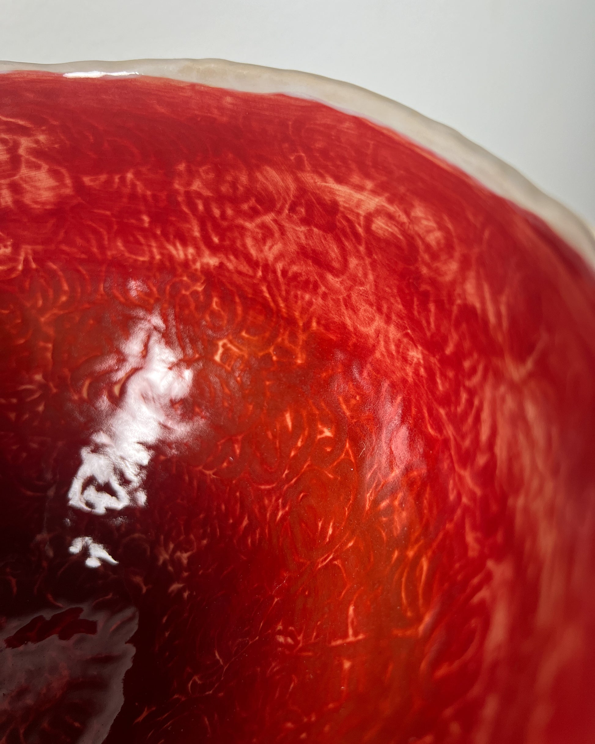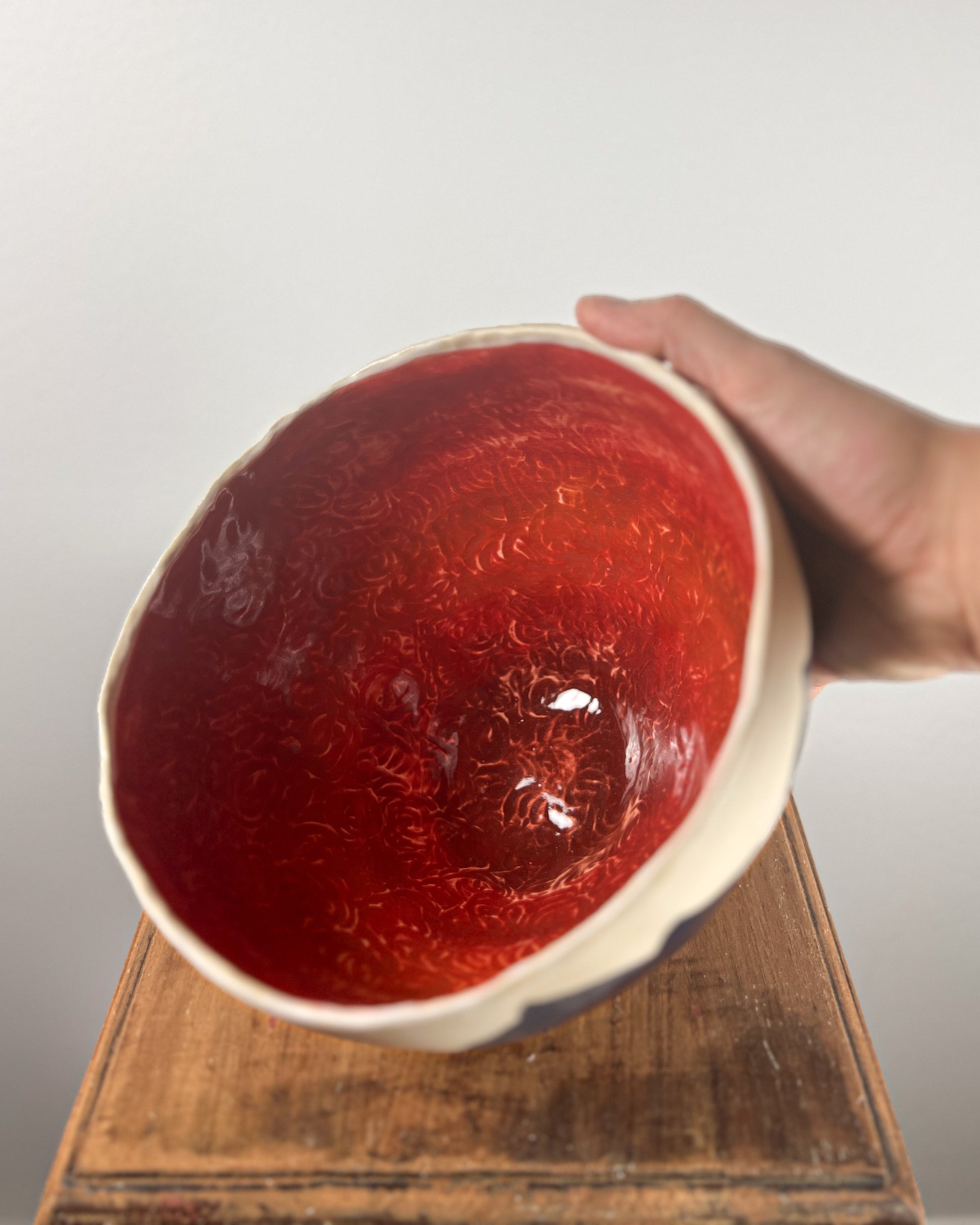 Insidan är färgad i orange-röd som trycktes/ristades in med en sten i ett mönster. Alltså är ytan svagt ojämn. Insidan är blank med en krackilerande glasyr.